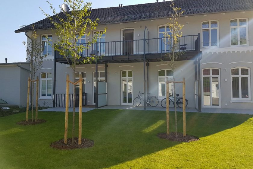 Auf dem vorderen Teil des Grundstückes befindet sich das Haupthaus mit zehn Apartments. Die zwei 4-Personen Wohnungen und sechs 2-Personen-Wohnungen sind modern eingerichtet und hochwertig ausgestattet. Bei dem Gebäude handelt es sich um einen wunderschönen Altbau, der umfassend kernsaniert wurde und als KFW 70- Effizienzhaus die heutigen Anforderungen an Energie einsparende Gebäude erfüllt.