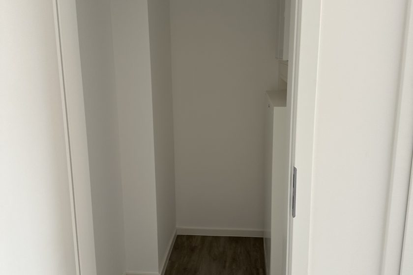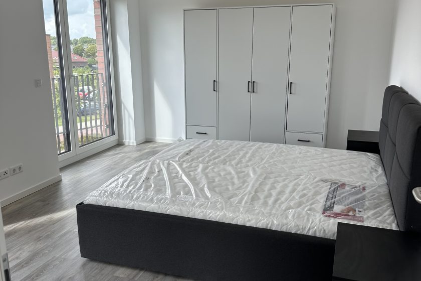 Im Schlafzimmer befindet sich ein großzügiges Bett, das zum erholsamen Schlafen einlädt, sowie ein passender Kleiderschrank, der ausreichend Platz für Ihre Garderobe bietet. Die schlichte und moderne Ausstattung sorgt für eine angenehme Ruhezone.