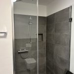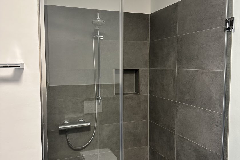 Das Badezimmer überzeugt mit einer ebenerdigen Dusche mit Glasabtrennung sowie einer eleganten Gestaltung in Grau und Weiß. Eine praktische Abstellkammer innerhalb des Appartements bietet zusätzlichen Stauraum.