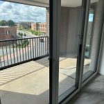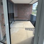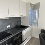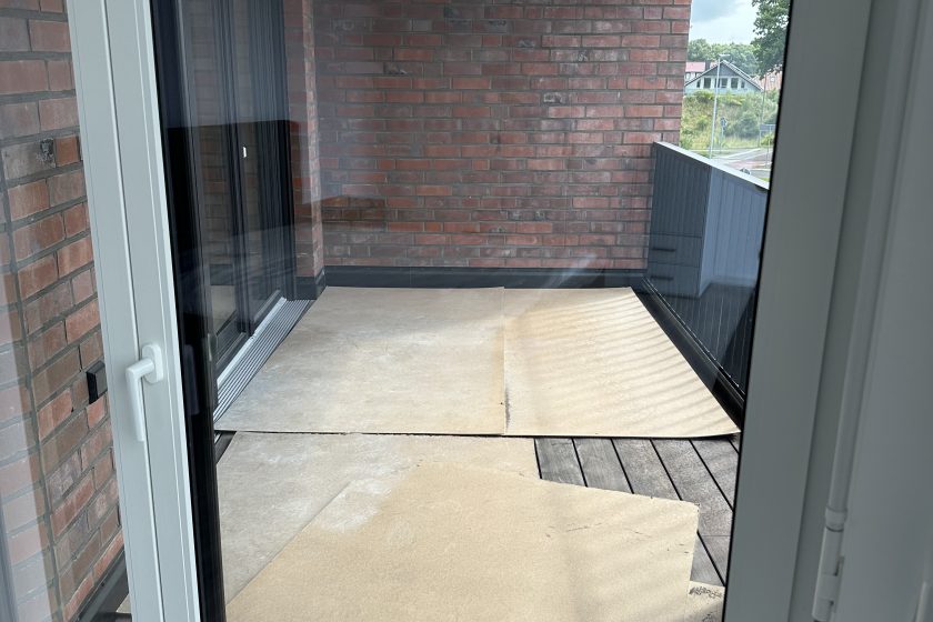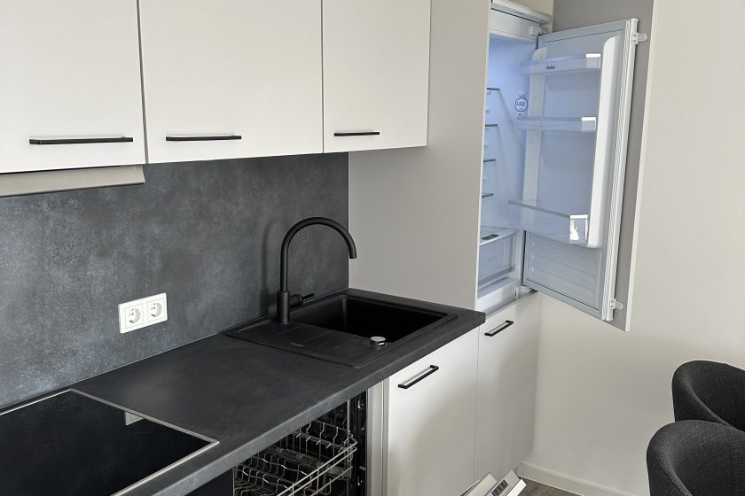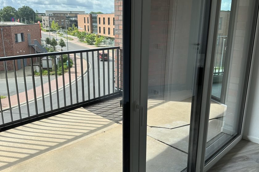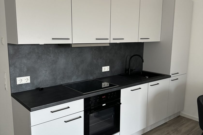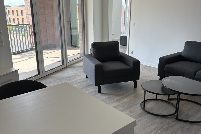 Die stilvolle Einrichtung in Weiß und Anthrazit/Schwarz verleiht den Wohnungen ein elegantes, zeitgemäßes Ambiente. Der Wohnbereich ist mit einem grauen Plankenbelag in Holzoptik ausgestattet, der sich harmonisch in das moderne Farbkonzept einfügt. Bodentiefe Fenster sorgen für eine helle, freundliche Atmosphäre und einen fließenden Übergang zum Balkon, der mit hochwertigen Terrassendielen in Holzoptik gestaltet ist – perfekt zum Entspannen im Freien.