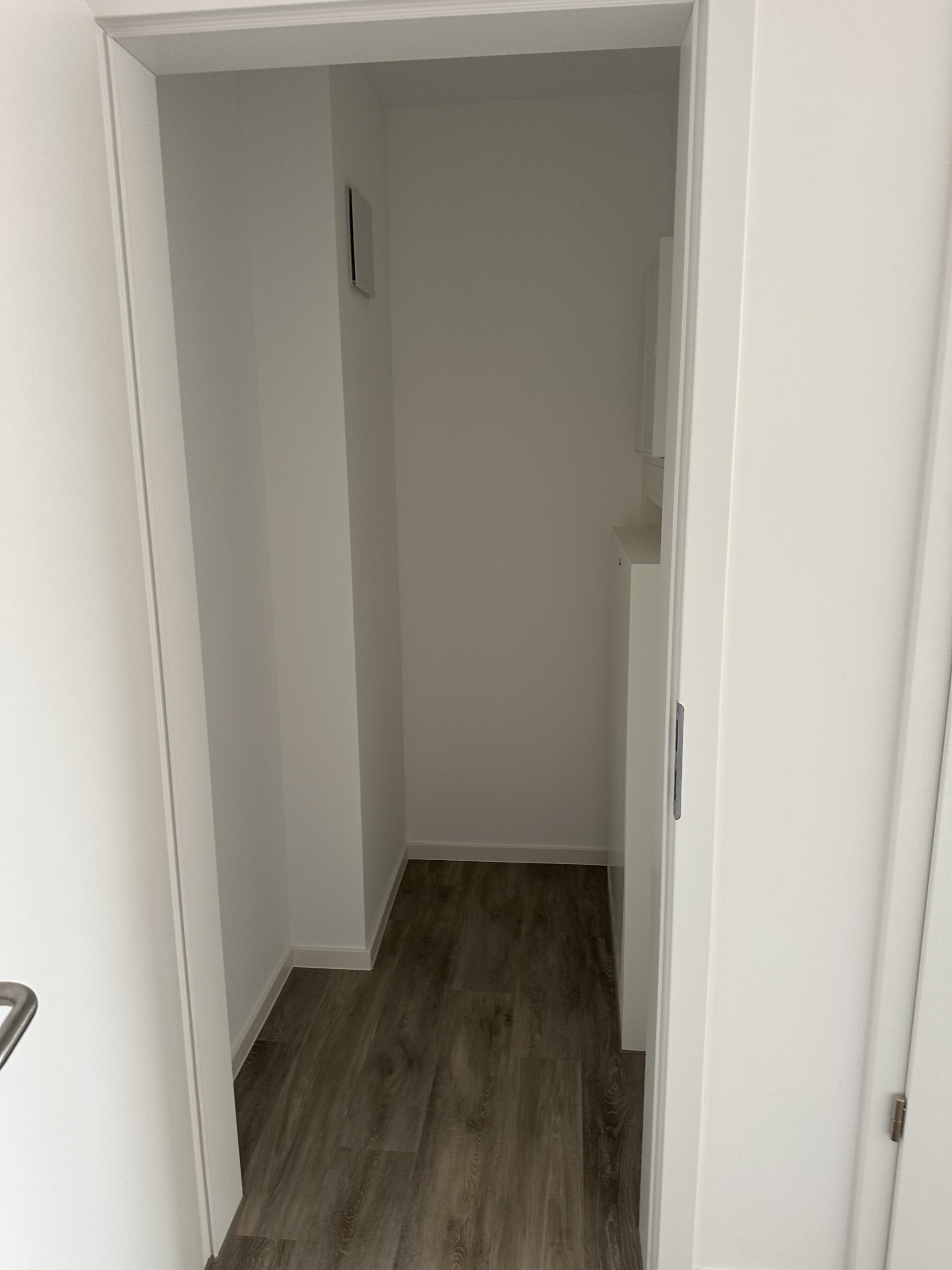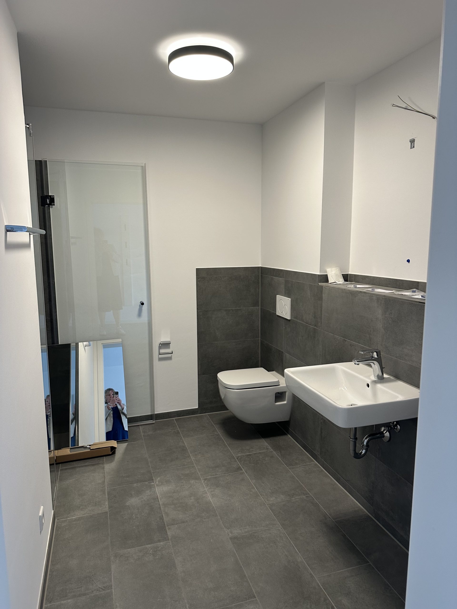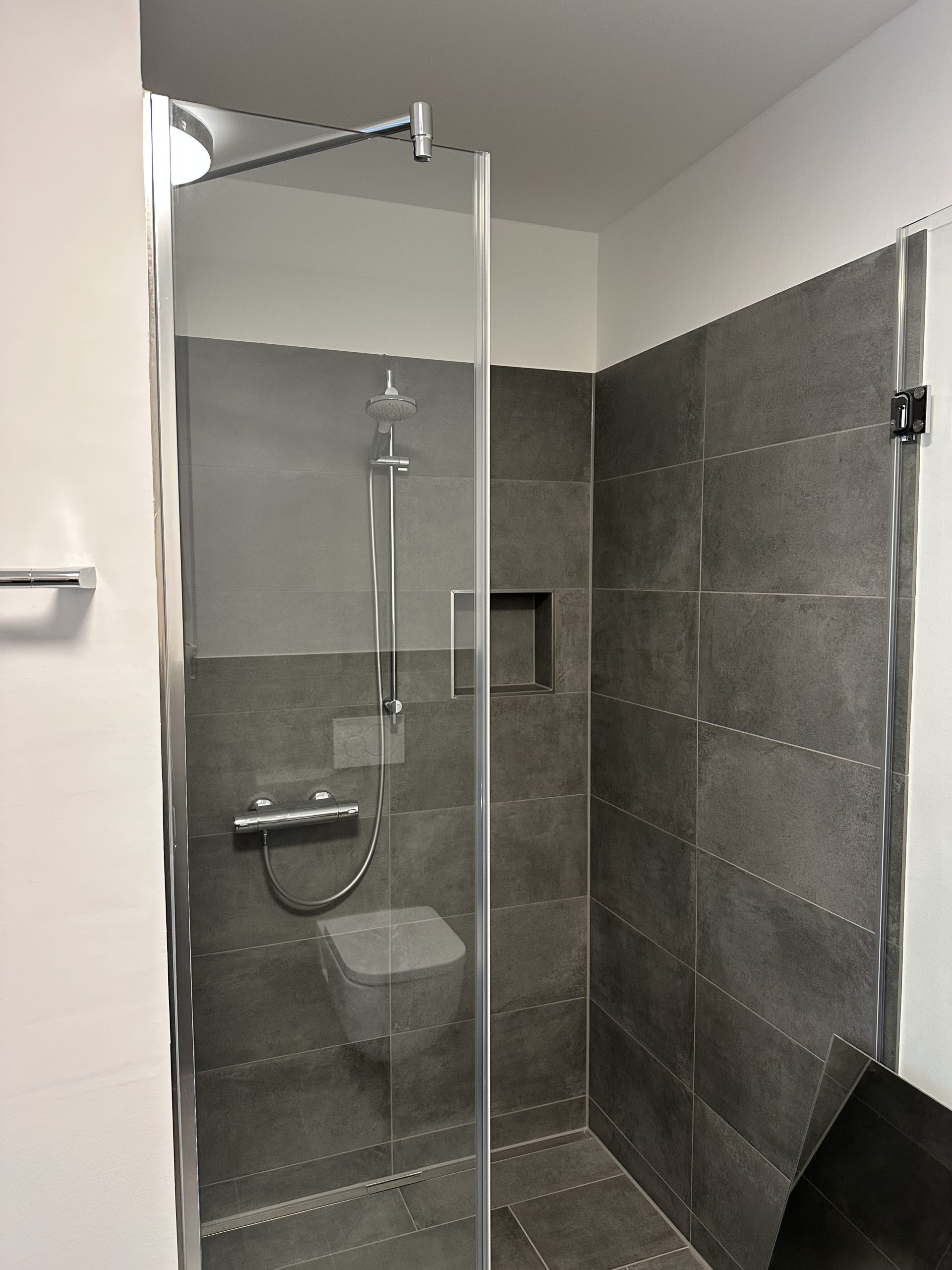 Das Badezimmer überzeugt mit einer ebenerdigen Dusche mit Glasabtrennung sowie einer eleganten Gestaltung in Grau und Weiß. Eine praktische Abstellkammer innerhalb des Appartements bietet zusätzlichen Stauraum.