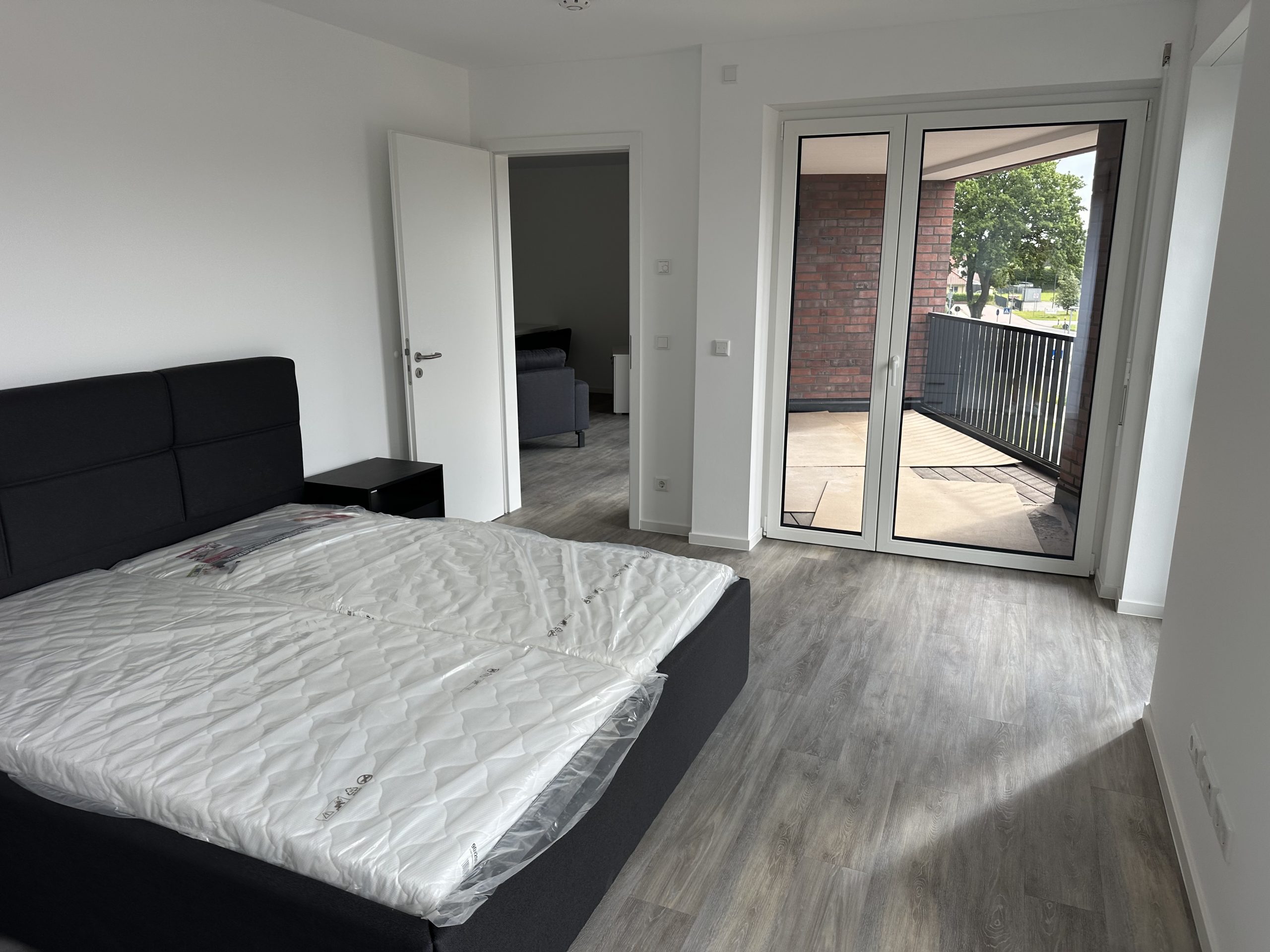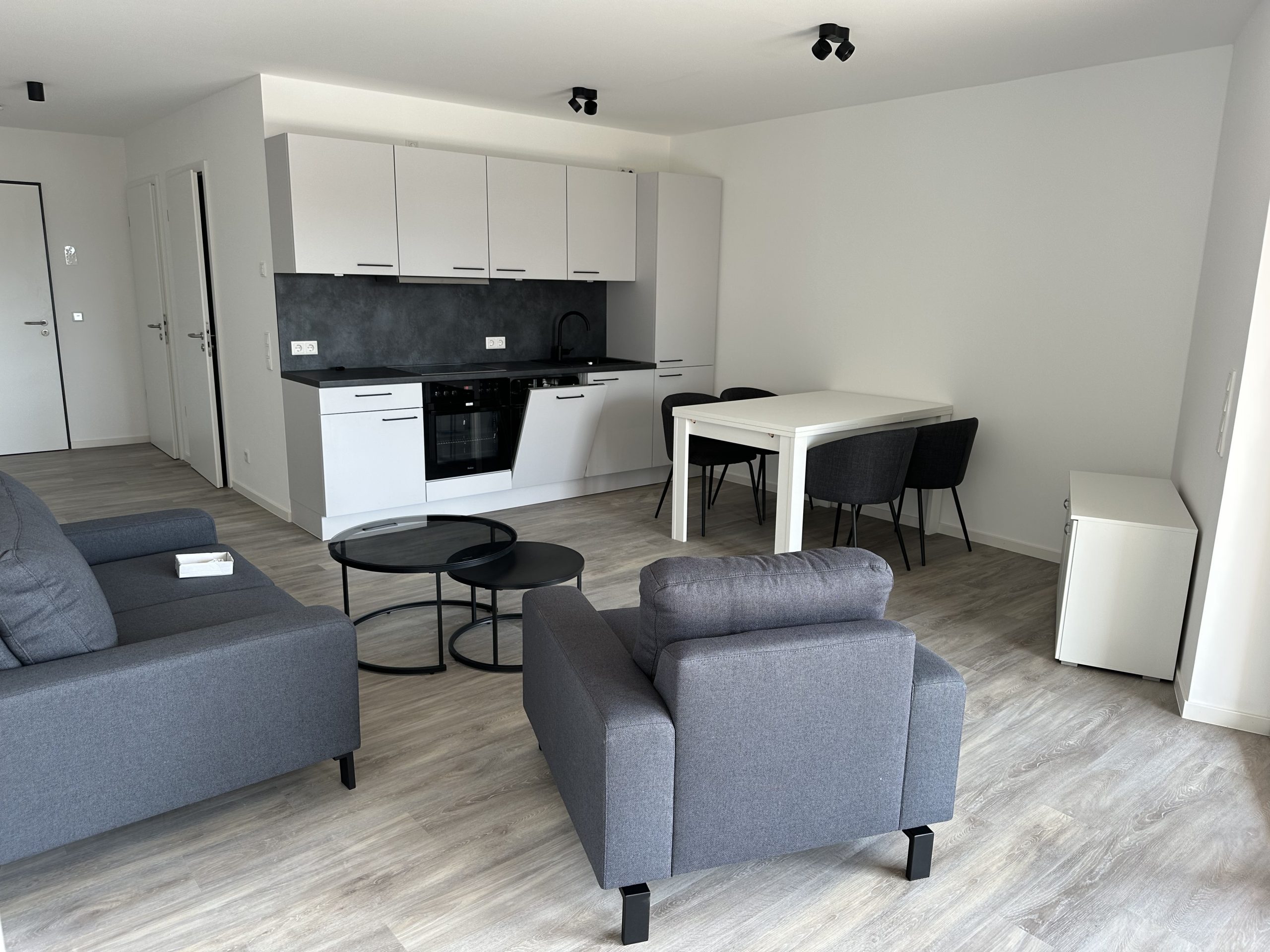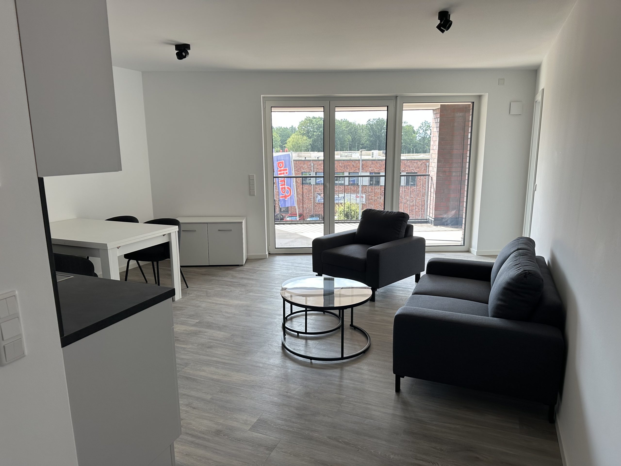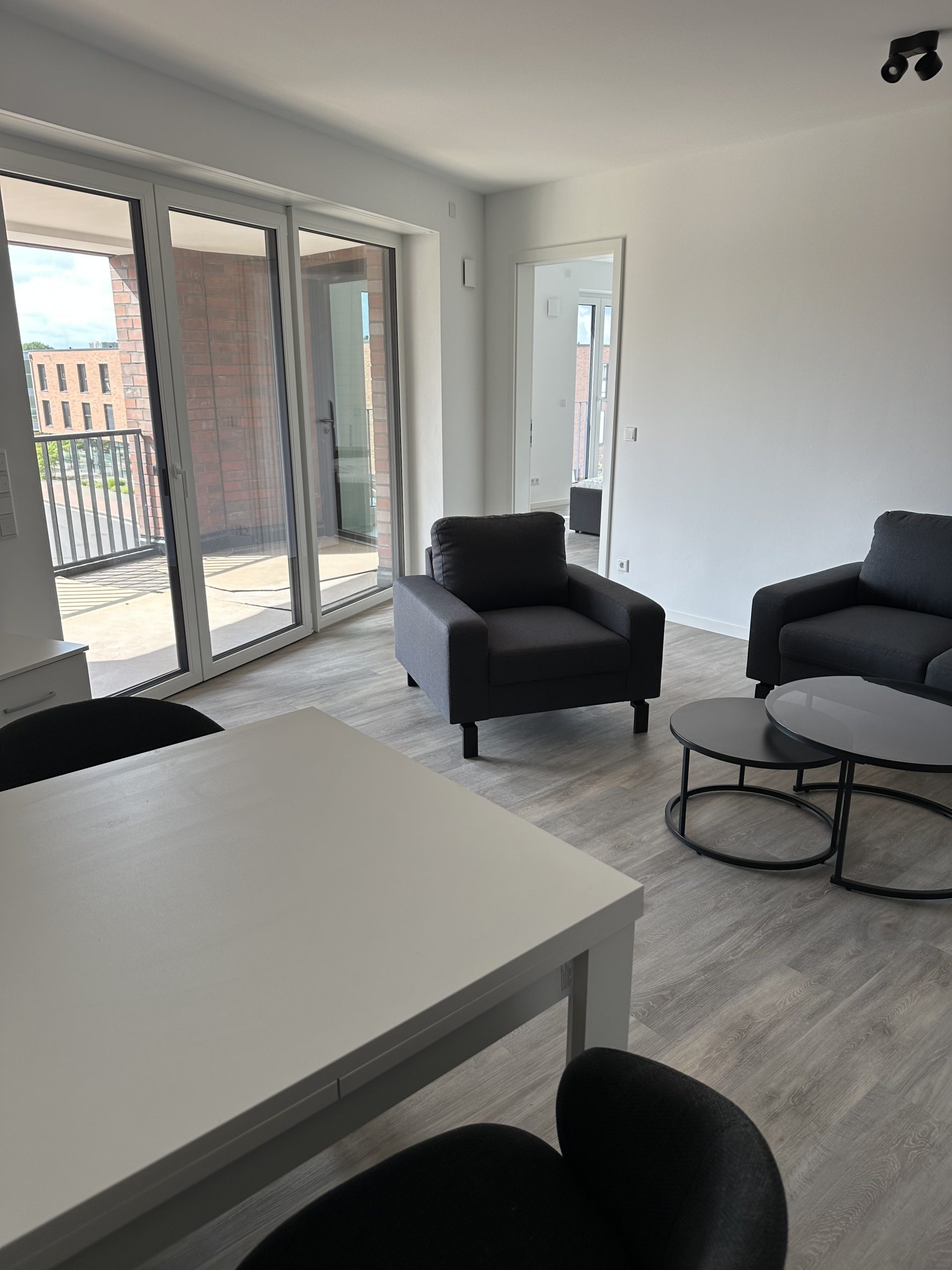 Die stilvolle Einrichtung in Weiß und Anthrazit/Schwarz verleiht den Wohnungen ein elegantes, zeitgemäßes Ambiente. Der Wohnbereich ist mit einem grauen Plankenbelag in Holzoptik ausgestattet, der sich harmonisch in das moderne Farbkonzept einfügt. Bodentiefe Fenster sorgen für eine helle, freundliche Atmosphäre und einen fließenden Übergang zum Balkon, der mit hochwertigen Terrassendielen in Holzoptik gestaltet ist – perfekt zum Entspannen im Freien.