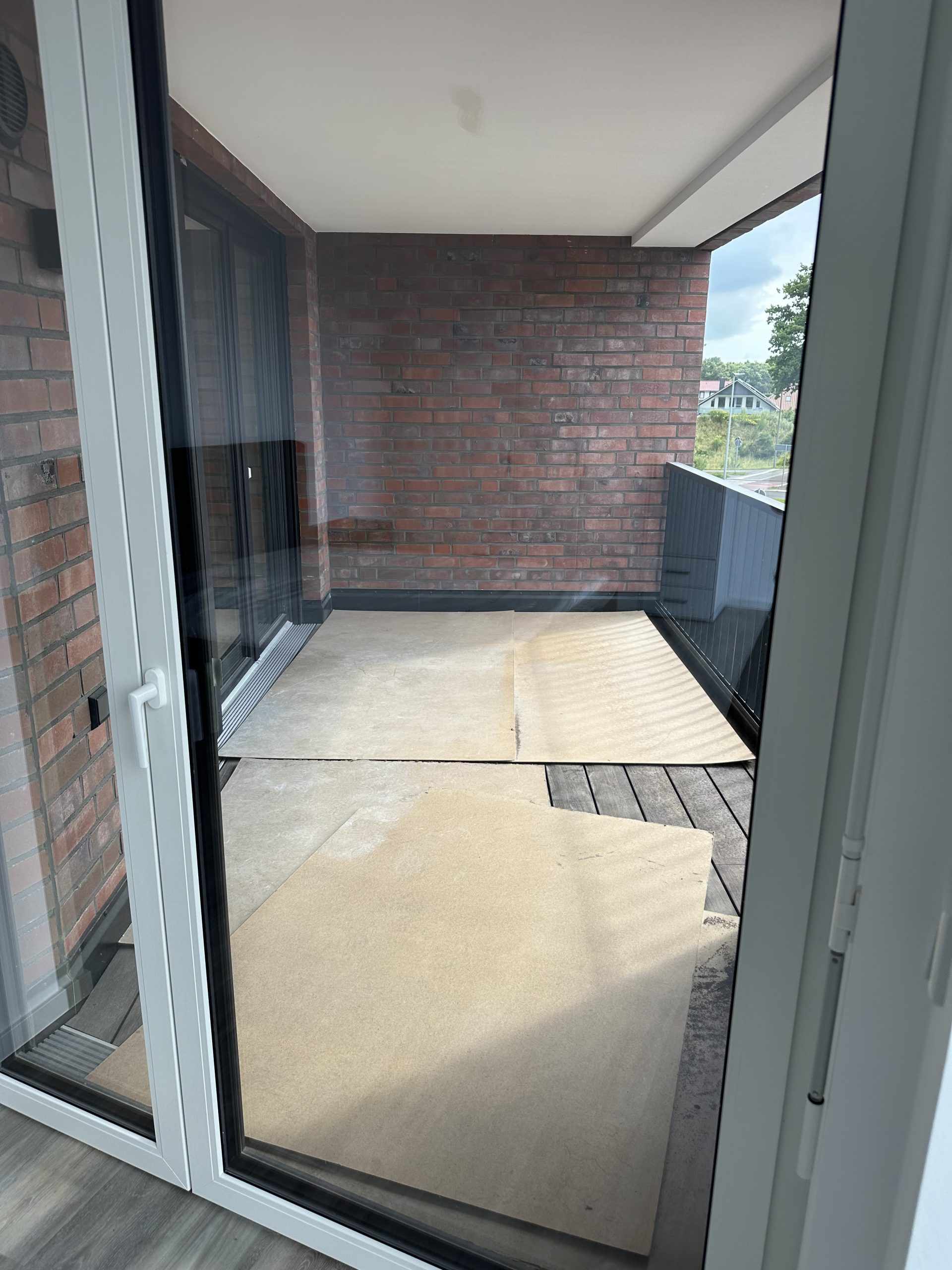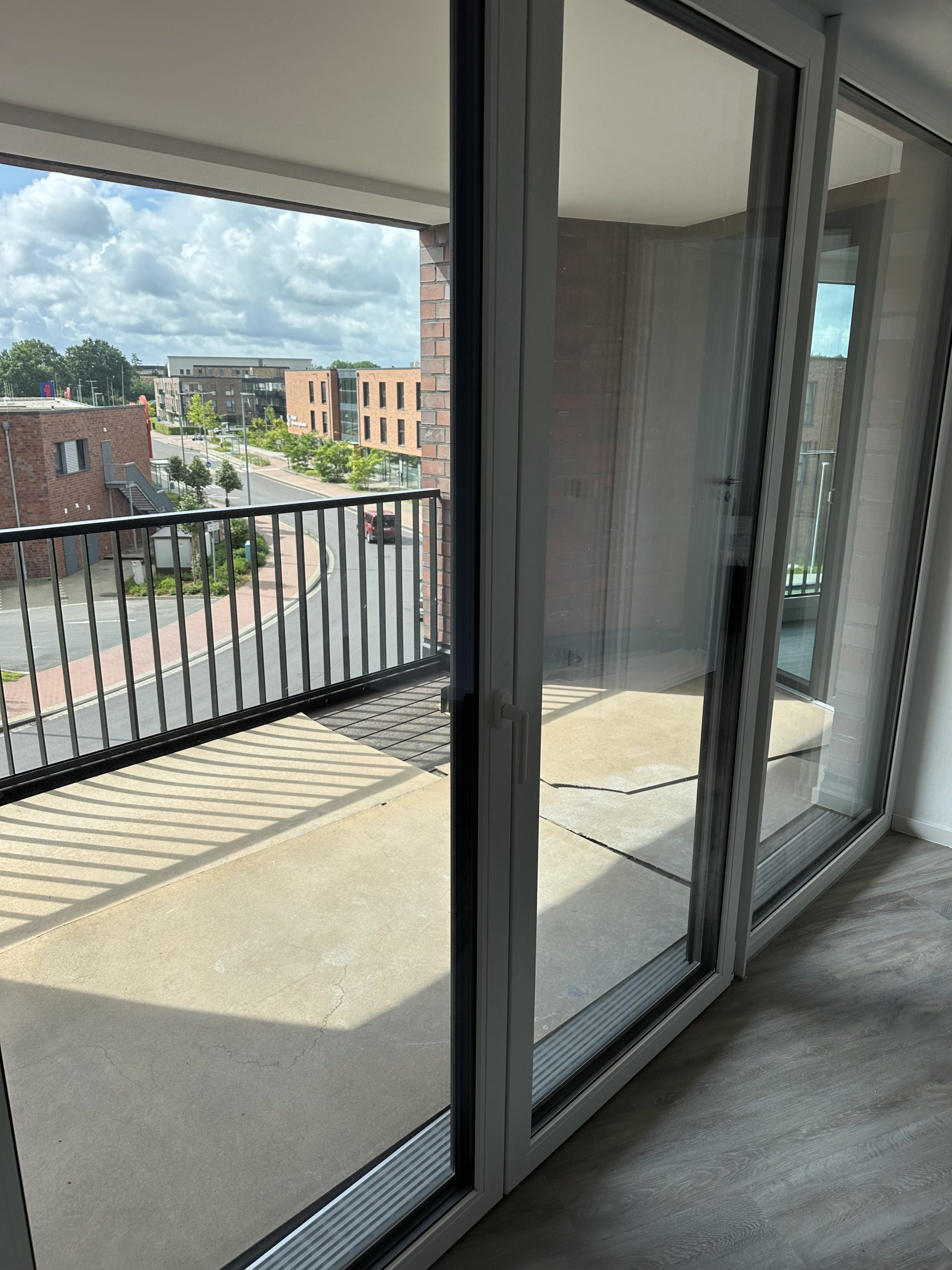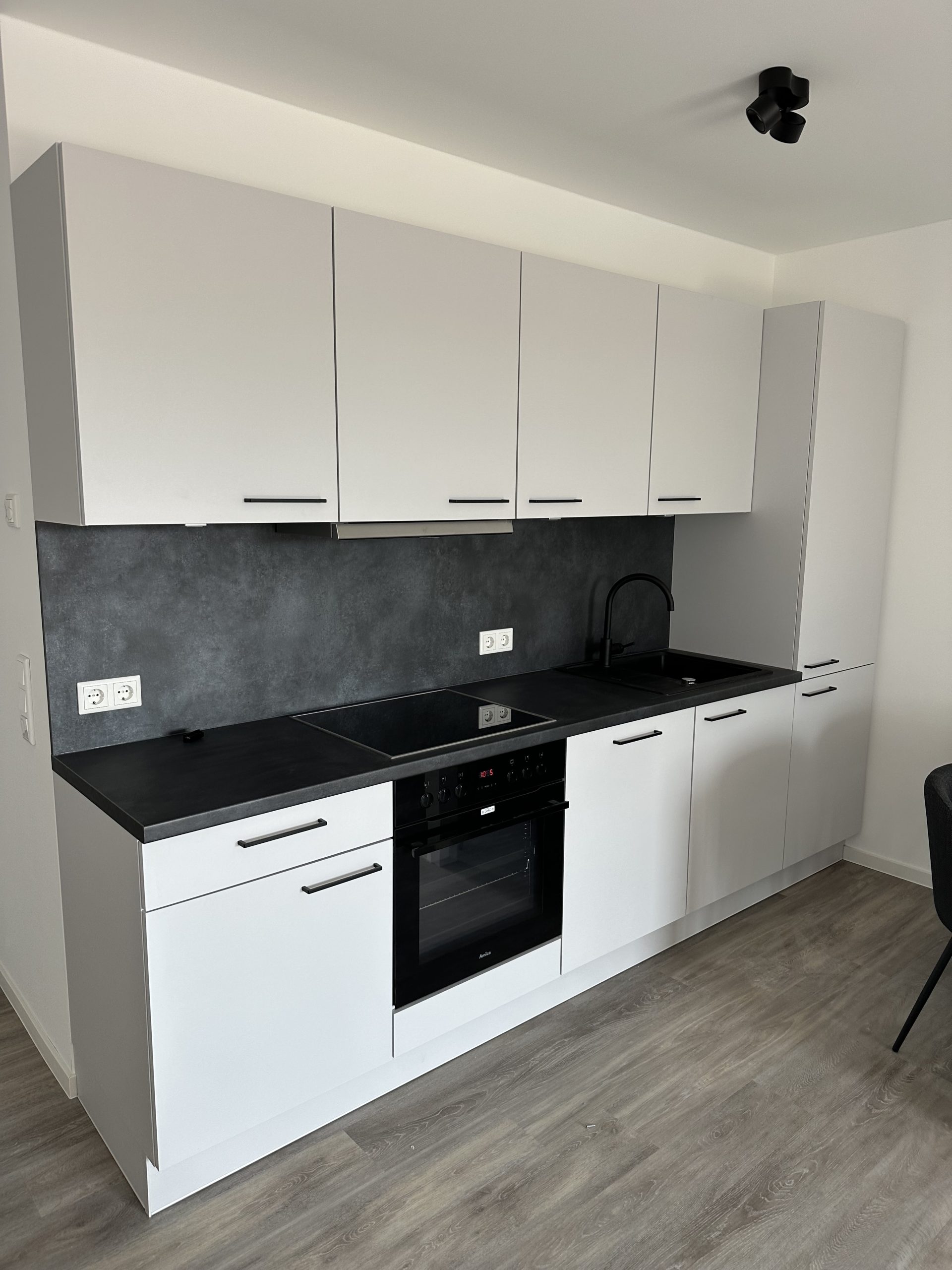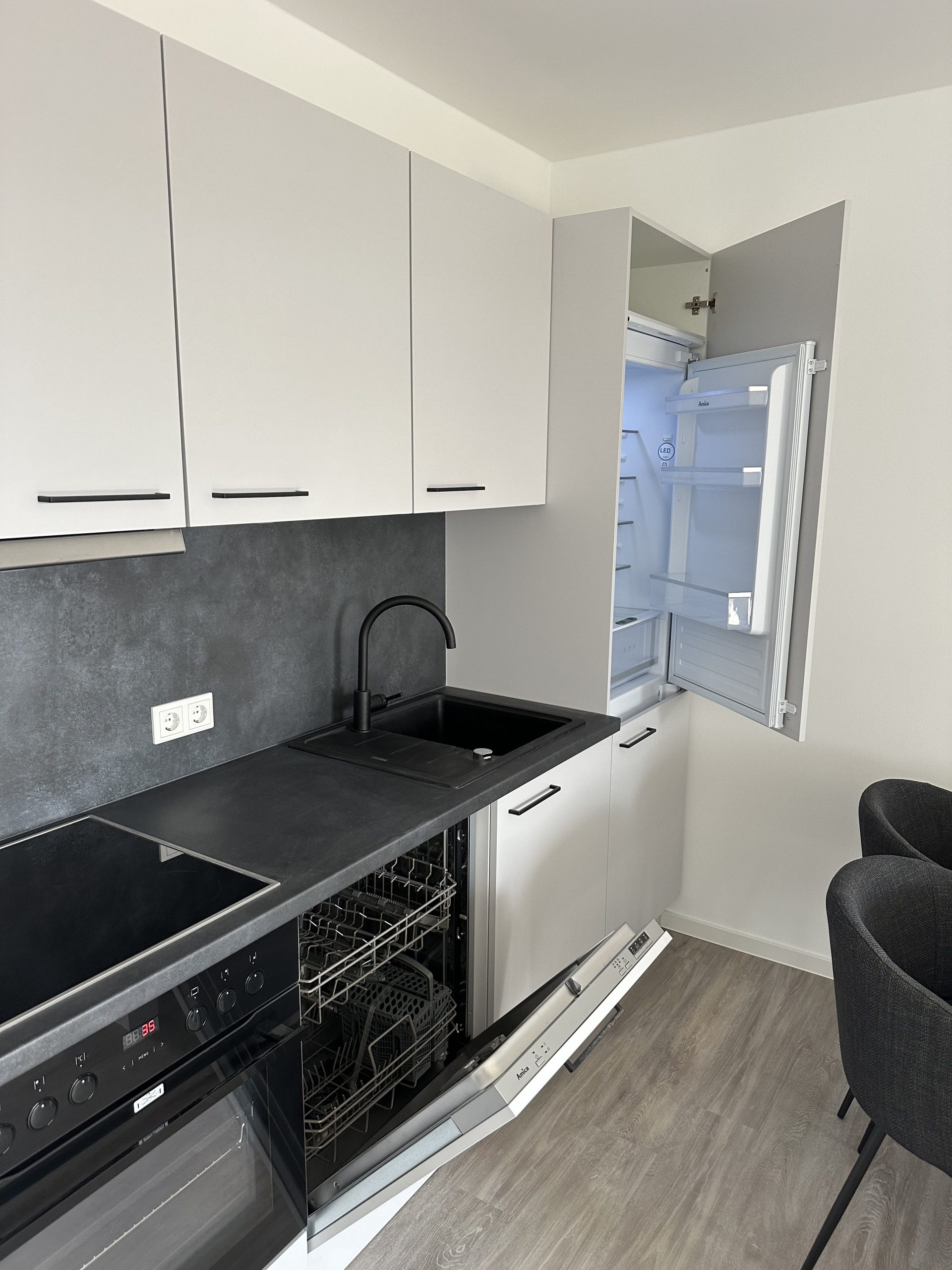 Die stilvolle Einrichtung in Weiß und Anthrazit/Schwarz verleiht den Wohnungen ein elegantes, zeitgemäßes Ambiente. Der Wohnbereich ist mit einem grauen Plankenbelag in Holzoptik ausgestattet, der sich harmonisch in das moderne Farbkonzept einfügt. Bodentiefe Fenster sorgen für eine helle, freundliche Atmosphäre und einen fließenden Übergang zum Balkon, der mit hochwertigen Terrassendielen in Holzoptik gestaltet ist – perfekt zum Entspannen im Freien.