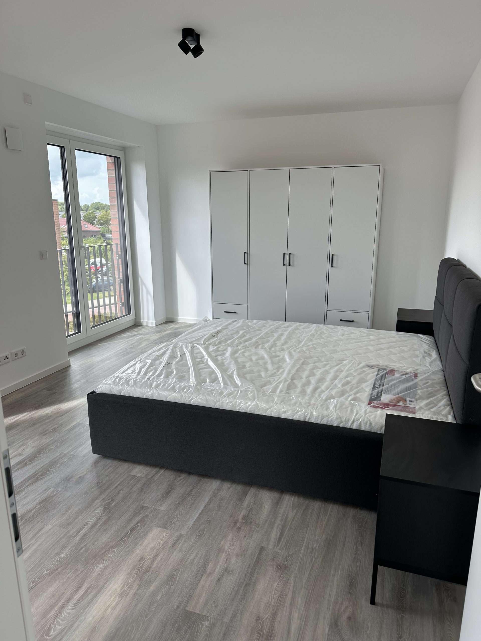 Im Schlafzimmer befindet sich ein großzügiges Bett, das zum erholsamen Schlafen einlädt, sowie ein passender Kleiderschrank, der ausreichend Platz für Ihre Garderobe bietet. Die schlichte und moderne Ausstattung sorgt für eine angenehme Ruhezone.