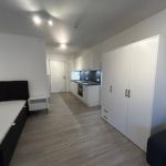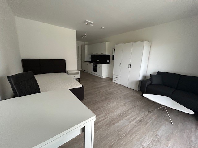 Die Wohnung ist mit einem Tisch und zwei Stühlen, einem Bett, ein Sofa und einem Kleiderschrank ausgestattet.